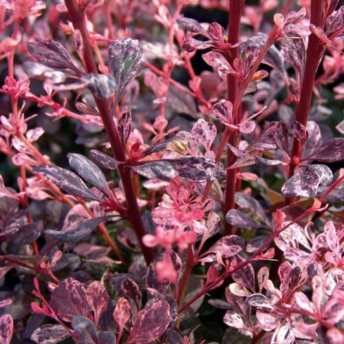 Листва барбариса Арлекин густая, мелкая, размером от 1 до 3 см. Окраска листьев бордовая, украшенная белыми, розовыми и серыми пятнышками. Листва на растении держится до поздней осени, иногда сохраняясь на нем весь зимний период.