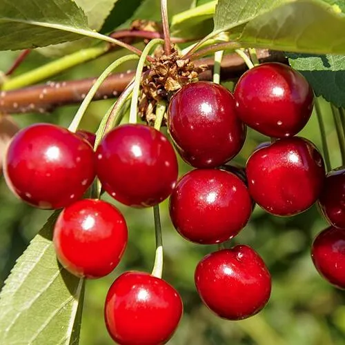 - Округло-сердцевидной, с незаметным малым брюшным швом, формы, одного размера, тёмно-красного цвета. Плодоножка хорошо отделяется. Кожица не толстая, глянцевая. Мякоть приятная и сочная, тёмно-красного, а сок – красного цвета. Косточка мелкая, округлой формы, легко извлекается;