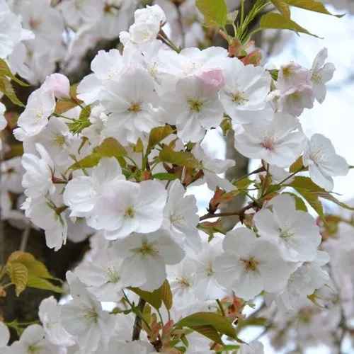 - Пильчатая. Дерево густое, шаровидное, очень высокое, размером до 9 метров в вышину. Кора гладкая, коричневая и глянцевая. Листва продолговатая с зубчатыми краями светло зелёная. Осенью лист сакуры окрашивается в красный цвет. Бутоны цветов одиночные, белого цвета. Плоды красные, слегка продолговатые. Морозостойкая.